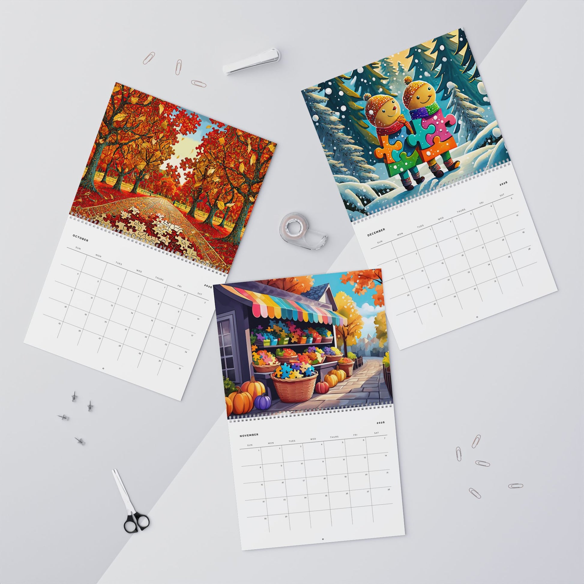 From a farmers market selling baskets of puzzle pieces to a pair of puzzle-piece pals surfing the waves, this calendar is an affectionate tribute to puzzle pieces, the thousands of little shapes that bring puzzlers joy and whimsy all year long! Now it's their turn to shine. And your turn to join in the fun, every day of the year!